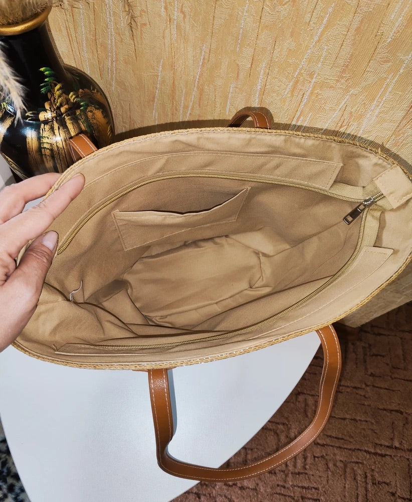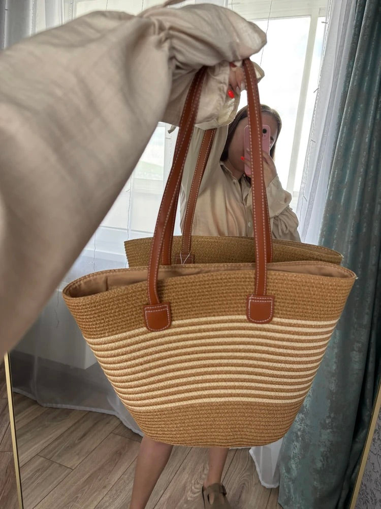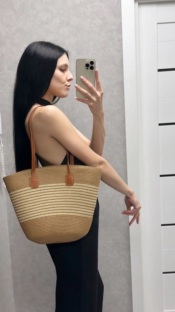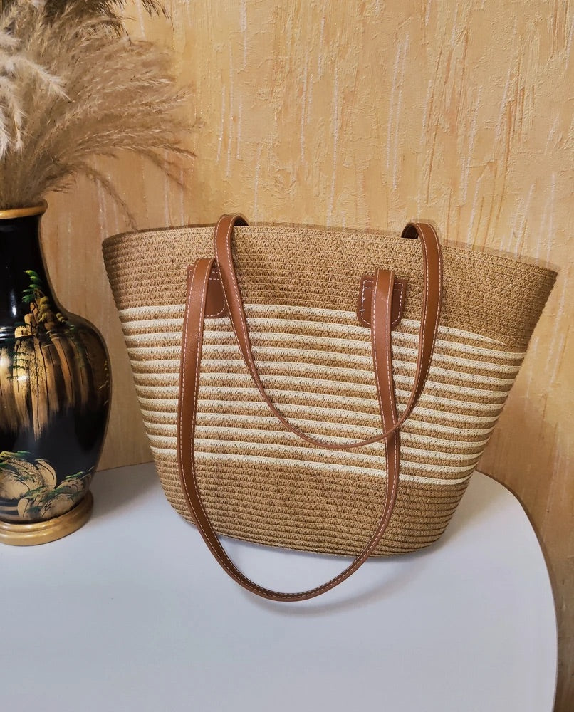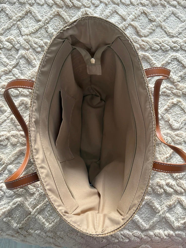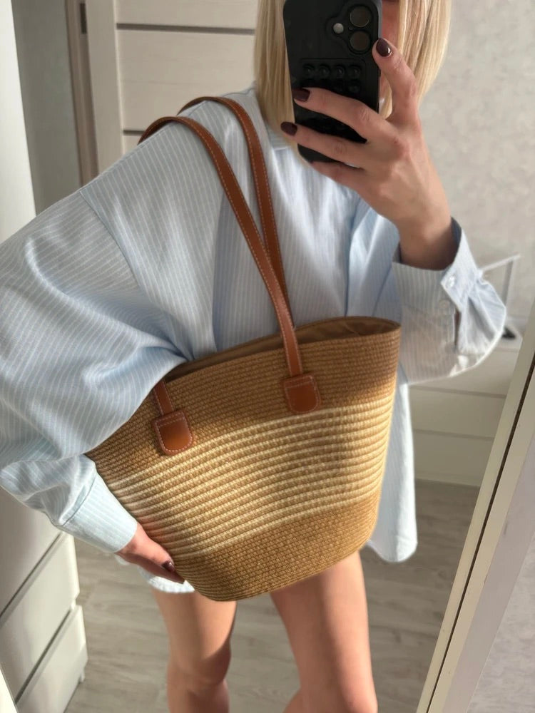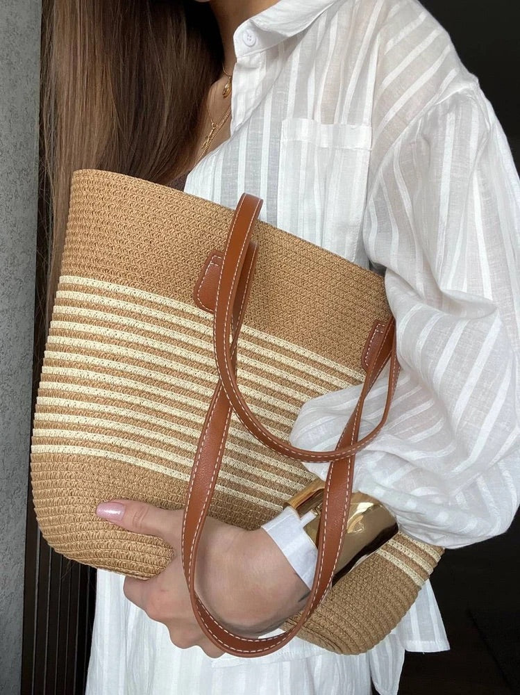 Progettata per accompagnare le giornate di sole, questa borsa da spiaggia in paglia intrecciata unisce un volume generoso a un look estivo. La sua texture naturale e la forma a trapezio si adattano perfettamente sia alle uscite al mare che alle passeggiate in città.