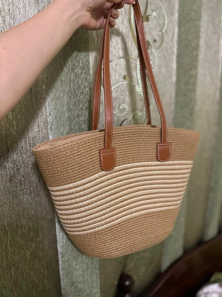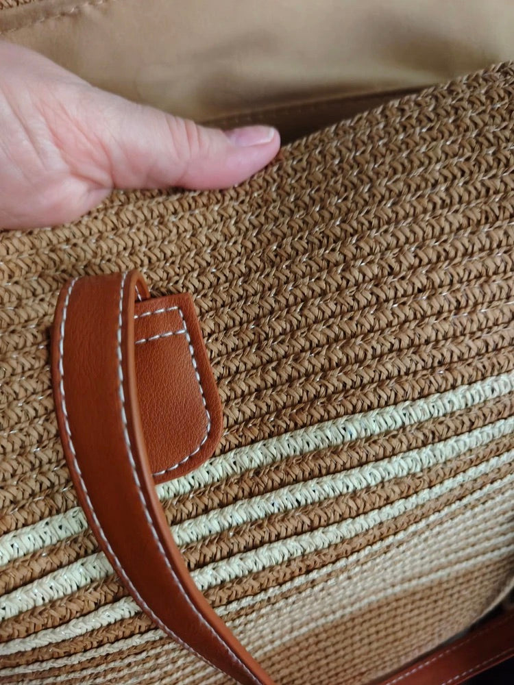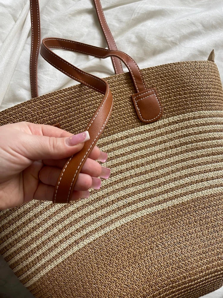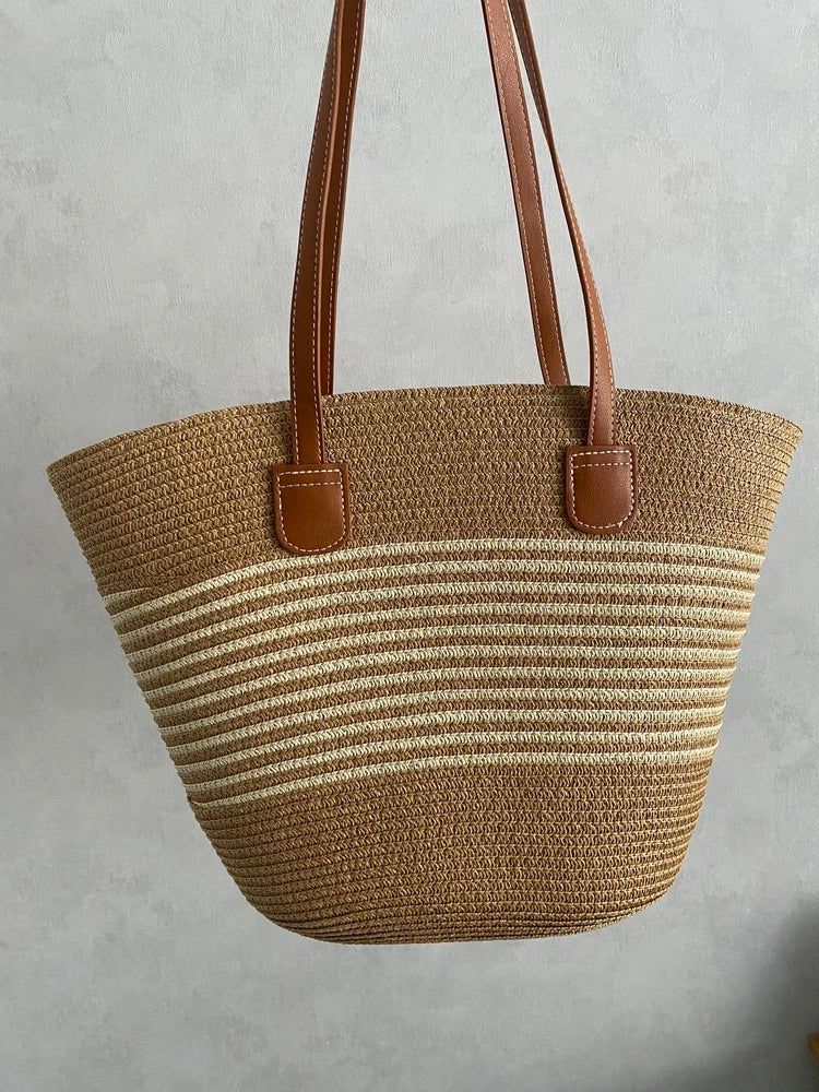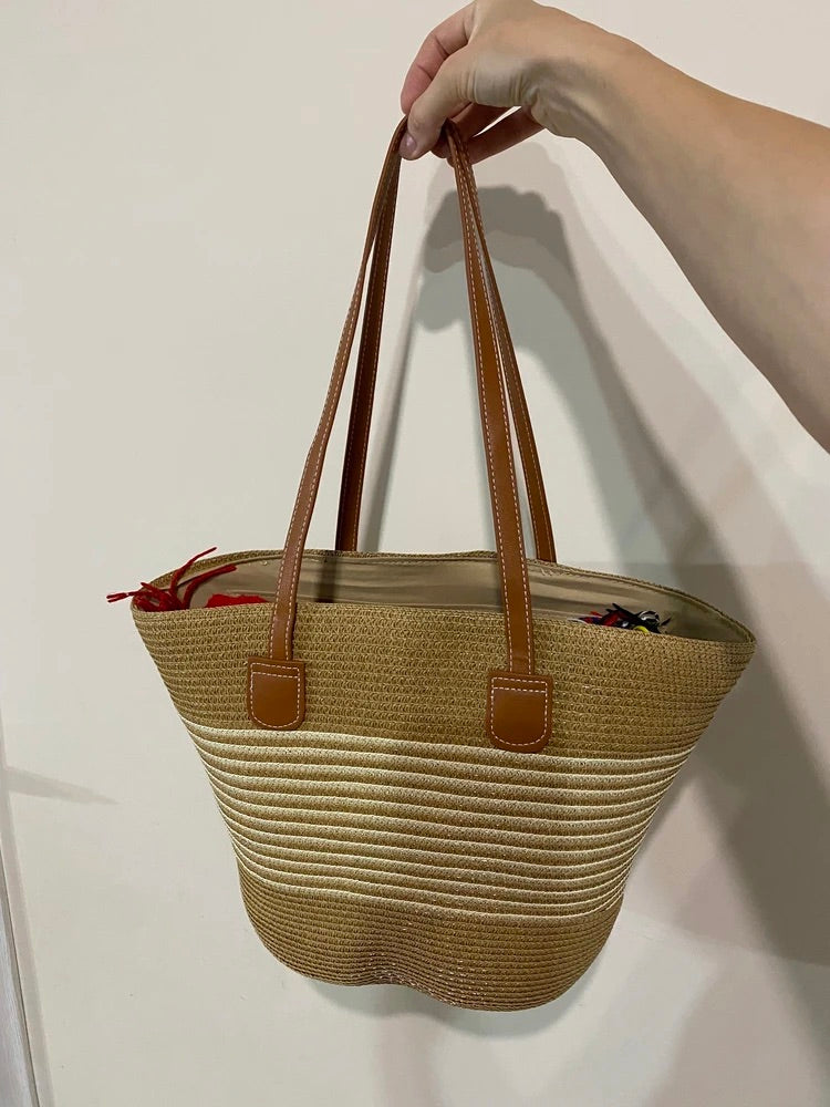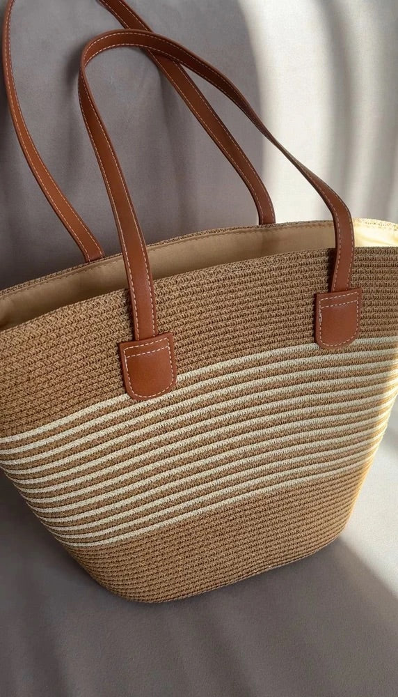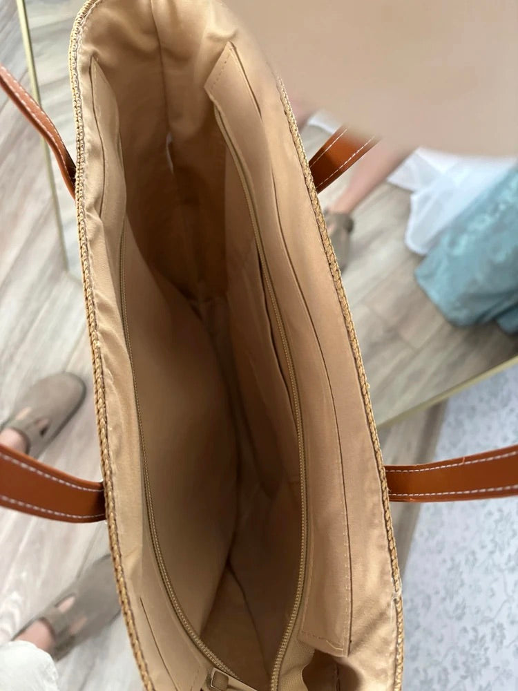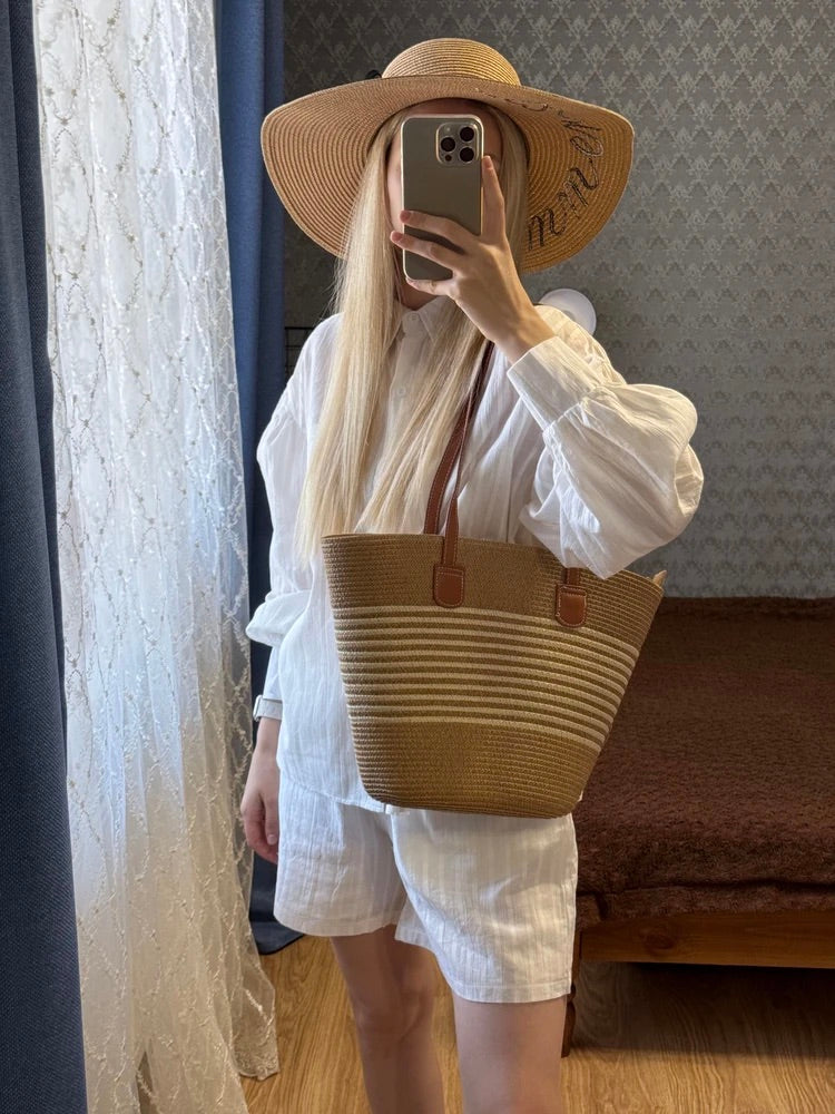 Progettata per accompagnare le giornate di sole, questa borsa da spiaggia in paglia intrecciata unisce un volume generoso a un look estivo. La sua texture naturale e la forma a trapezio si adattano perfettamente sia alle uscite al mare che alle passeggiate in città.