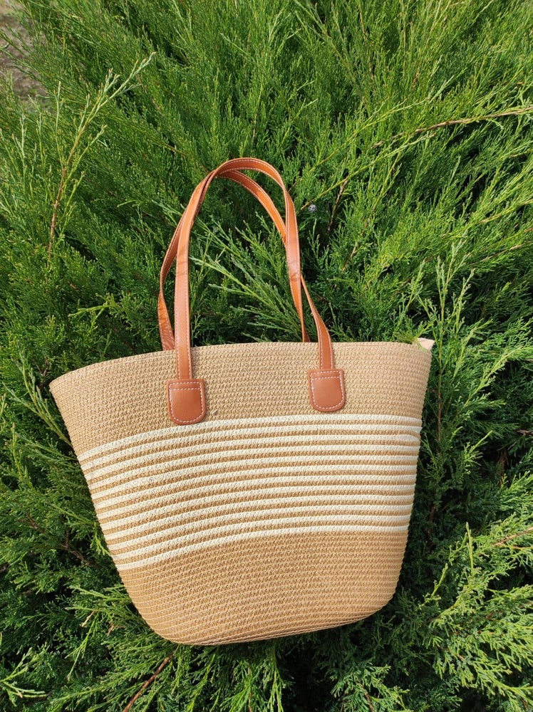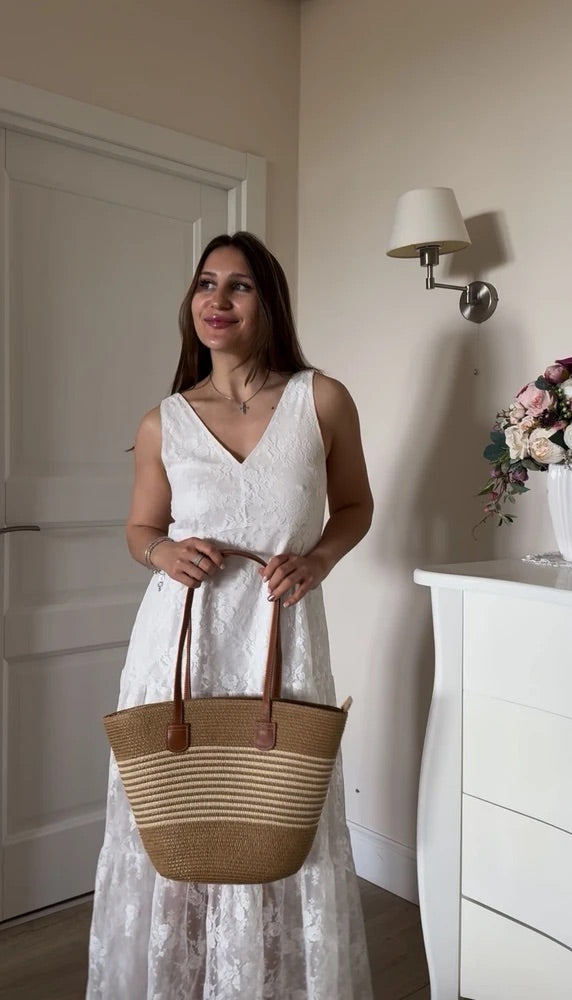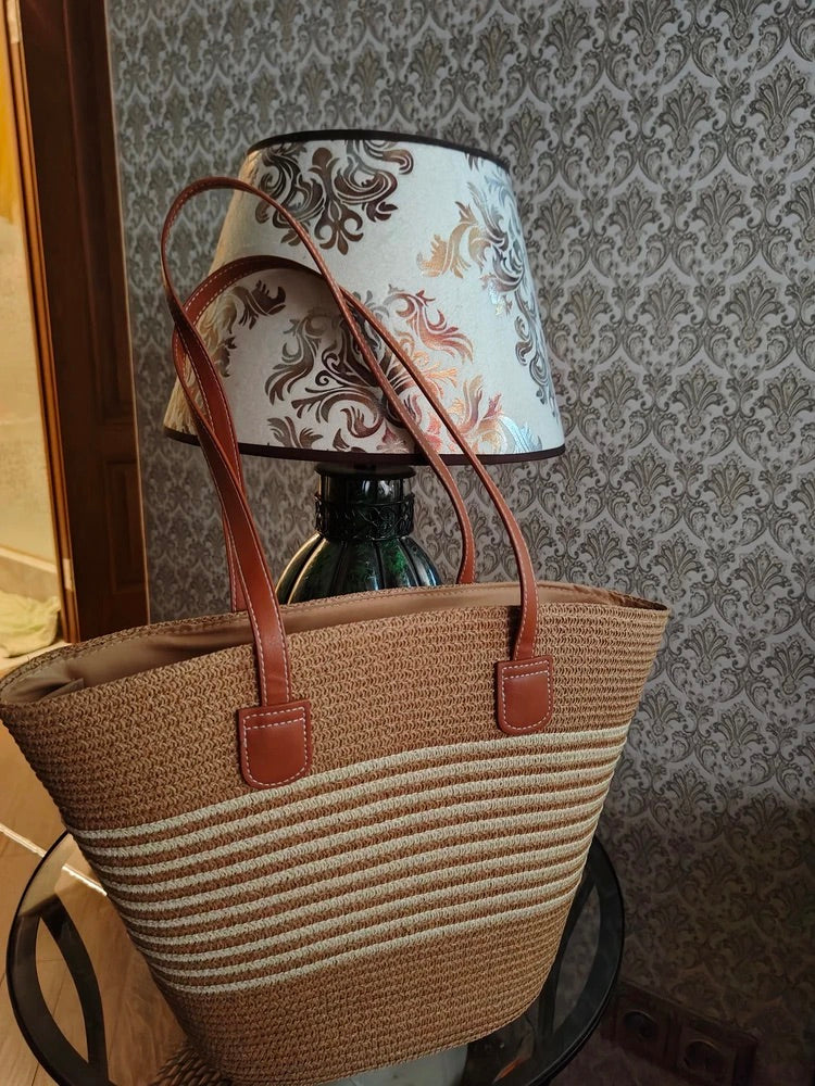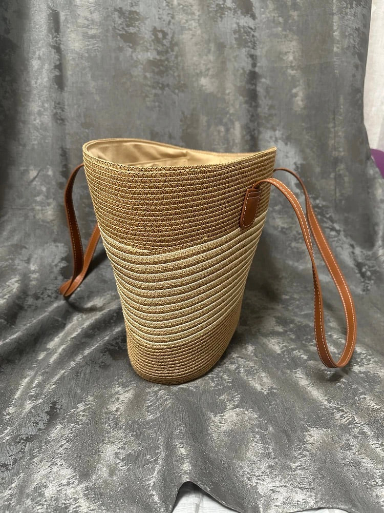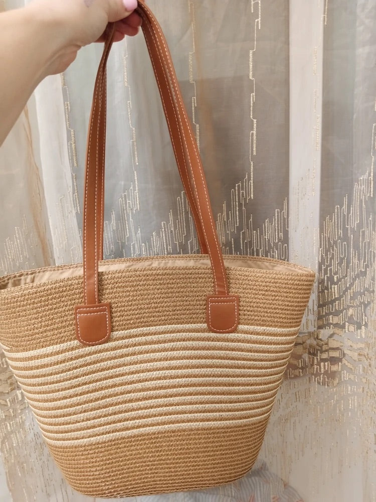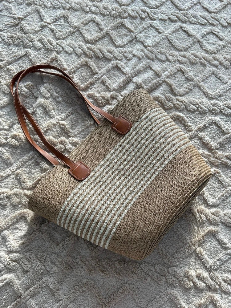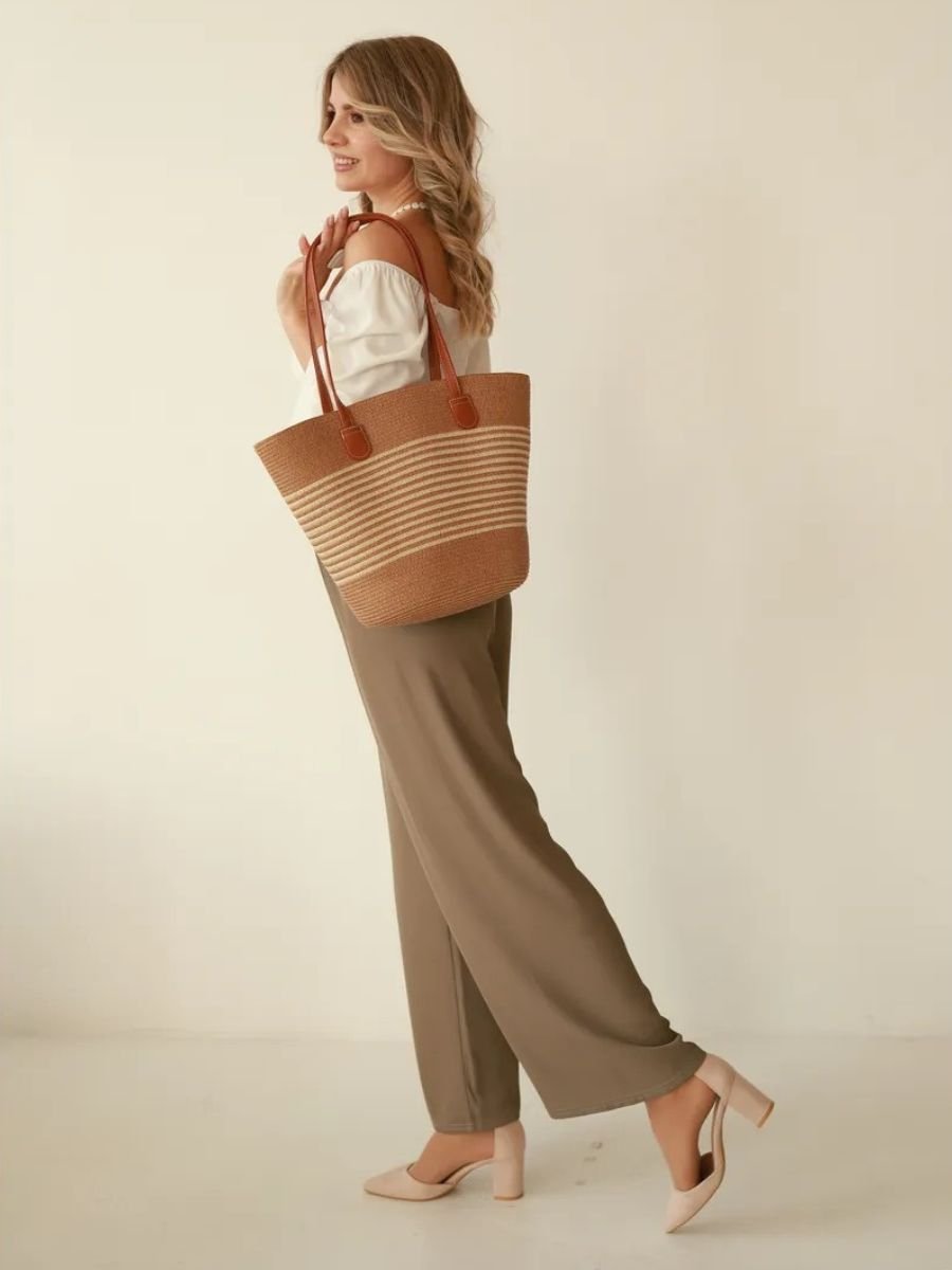 Progettata per accompagnare le giornate di sole, questa borsa da spiaggia in paglia intrecciata unisce un volume generoso a un look estivo. La sua texture naturale e la forma a trapezio si adattano perfettamente sia alle uscite al mare che alle passeggiate in città.
