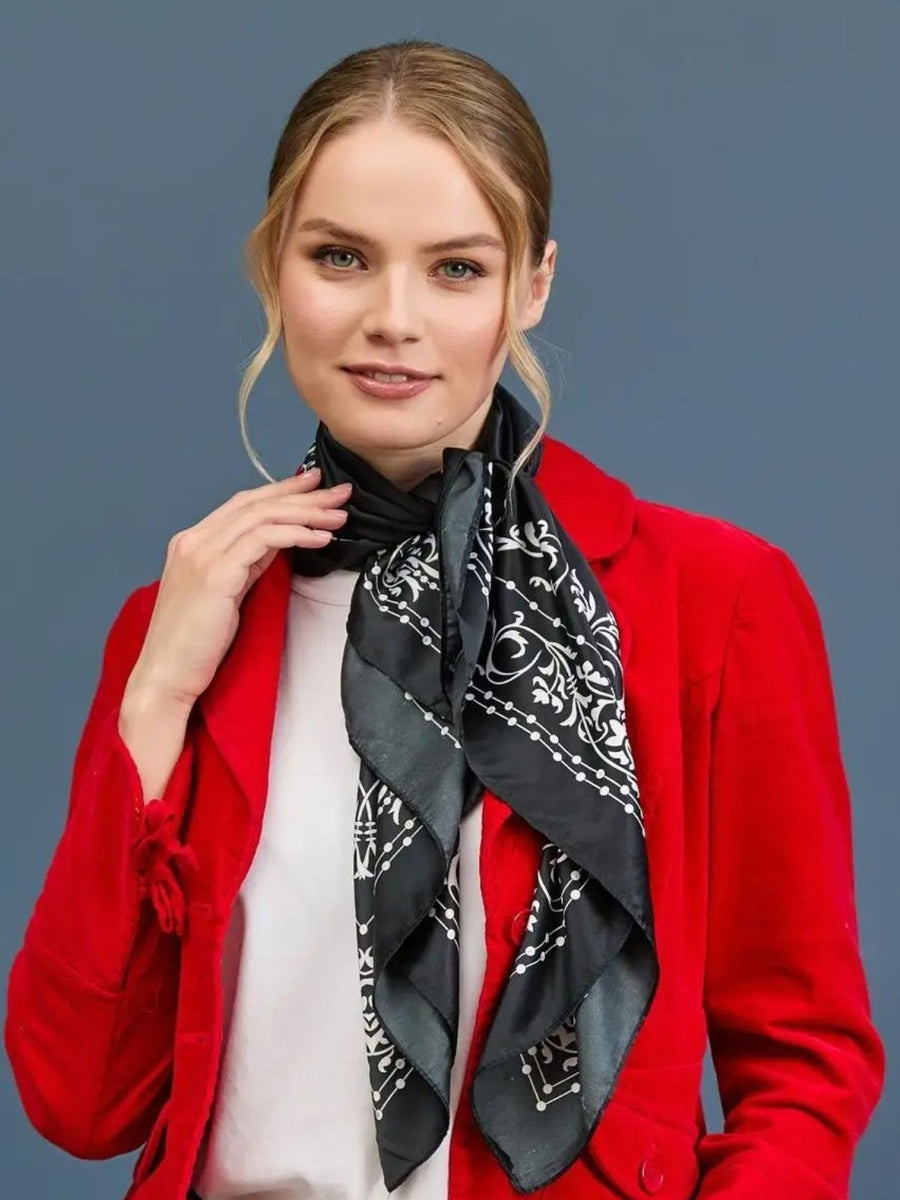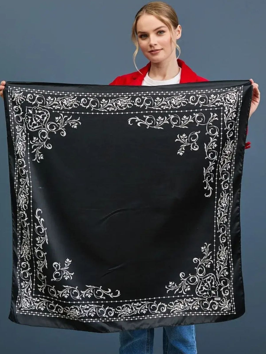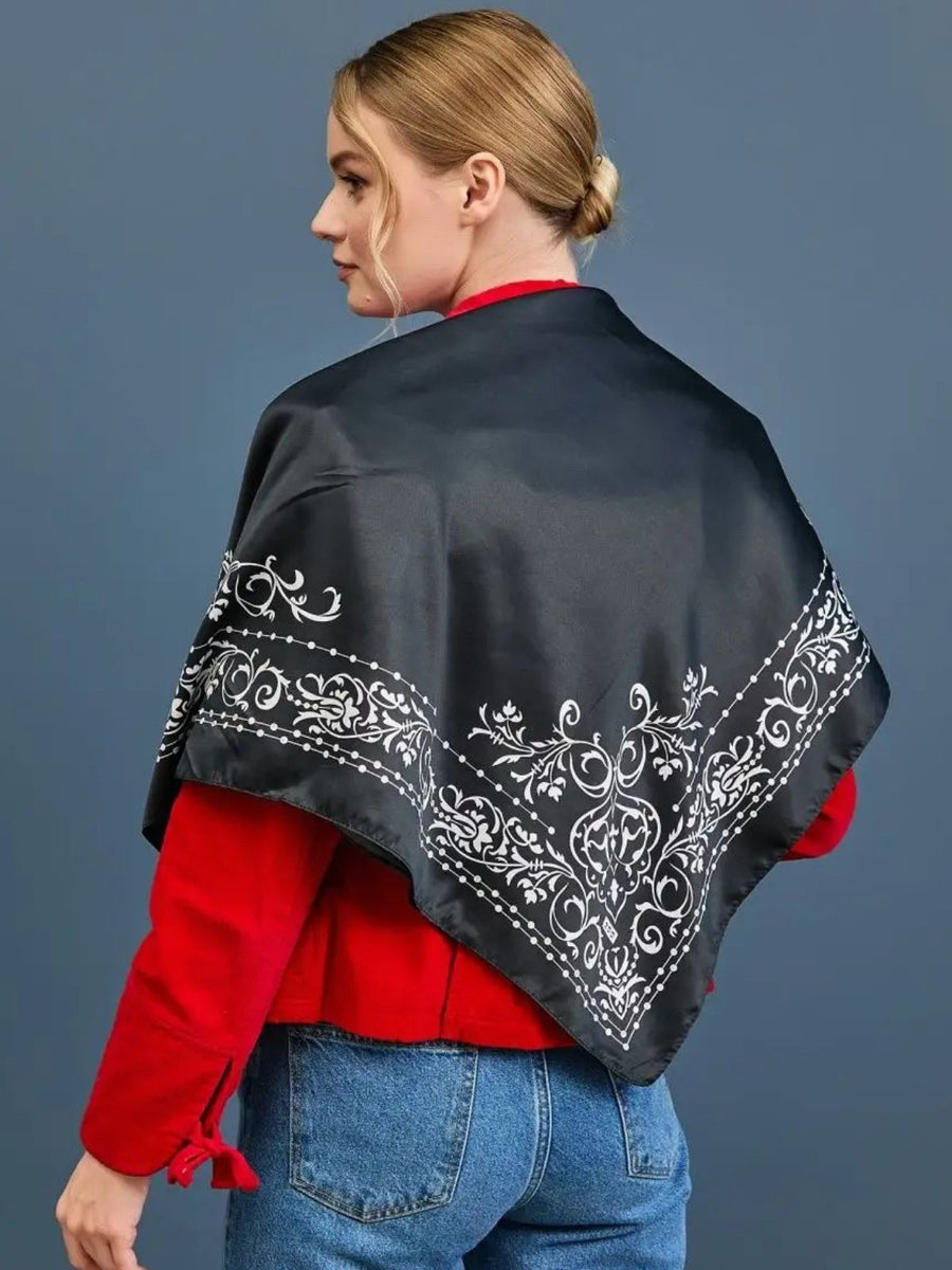 La sua delicata stampa bianca, ispirata a motivi floreali e ornamentali, risalta con eleganza su uno sfondo nero profondo, offrendo un contrasto raffinato. Il tessuto presenta un tocco setoso e fluido, molto piacevole sulla pelle e adatto a un utilizzo durante tutto l’anno, sia per proteggersi dal sole in estate che dal vento in primavera e in autunno.