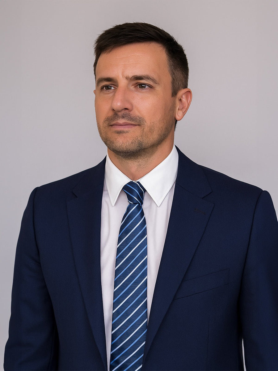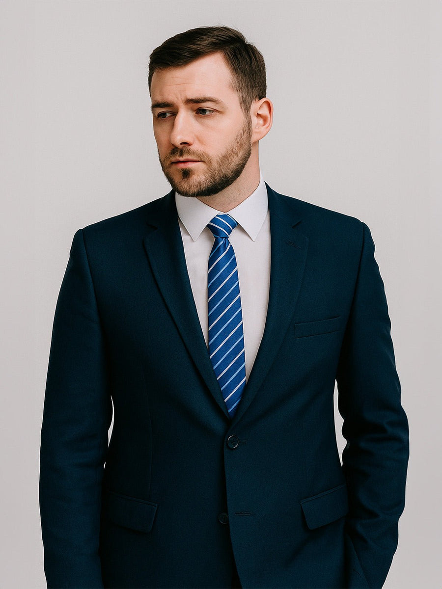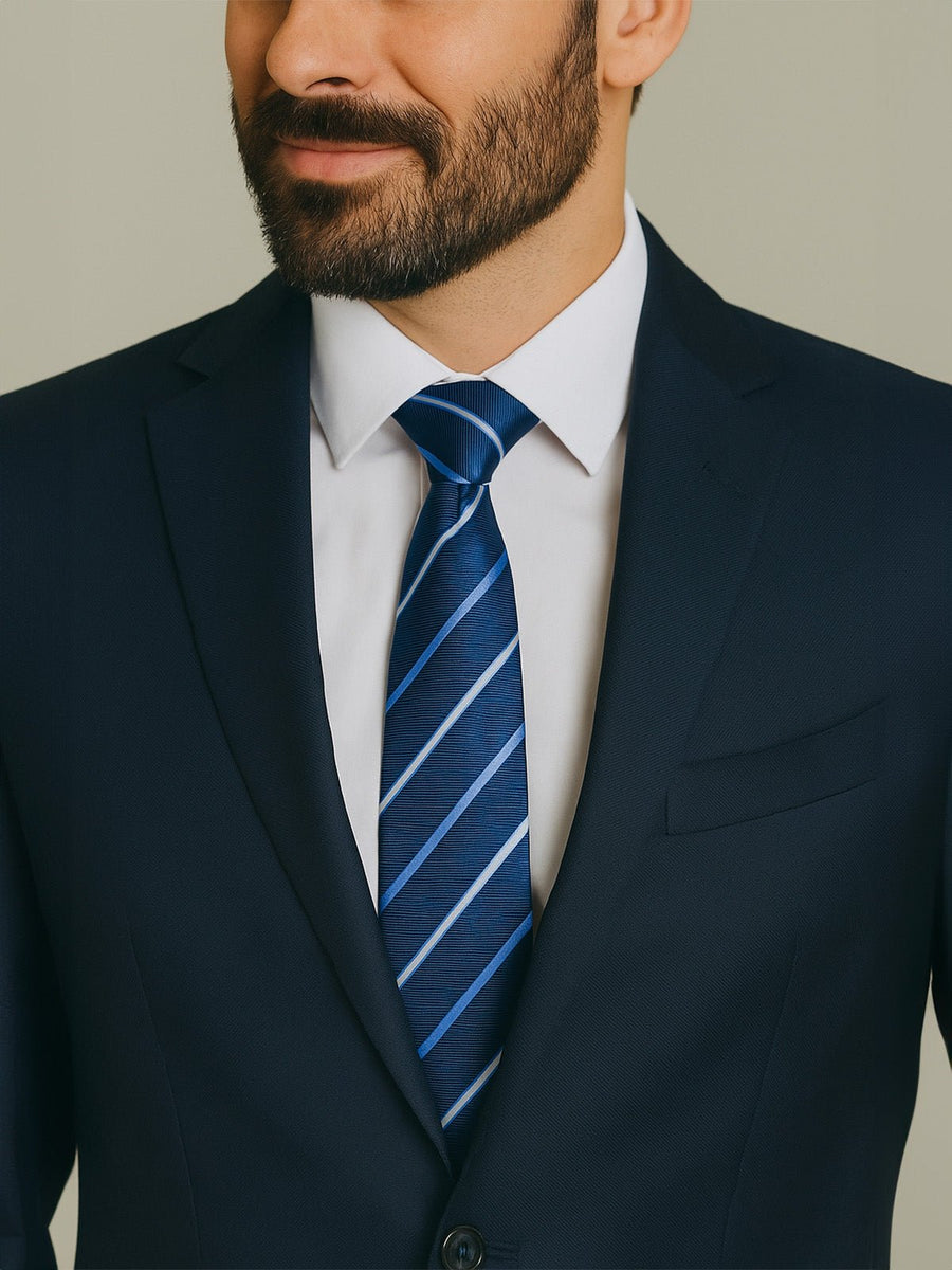 Il suo motivo a sottili righe diagonali gioca sui contrasti tra le tonalità di blu, aggiungendo un tocco grafico discreto senza mai appesantire la silhouette. Pensata per ambienti formali, questa cravatta si integra naturalmente in un guardaroba professionale: riunioni, appuntamenti con i clienti, colloqui, valorizza ogni outfit con eleganza.