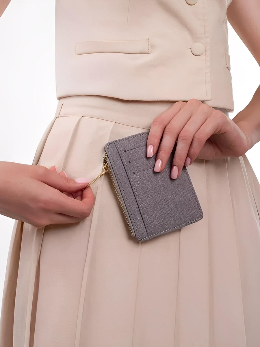 Disponibile in tre colori sobri — grigio chiaro, nero e blu — si adatta a qualsiasi abbigliamento e a tutte le tasche. Con la sua zip dorata a contrasto e lo stile minimalista, questo portafoglio diventa un accessorio di scelta sia per i viaggi di lavoro che per le passeggiate informali.