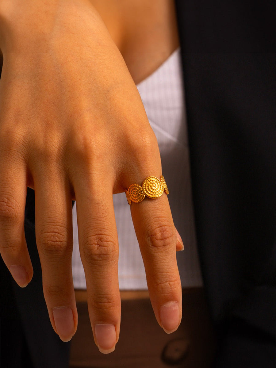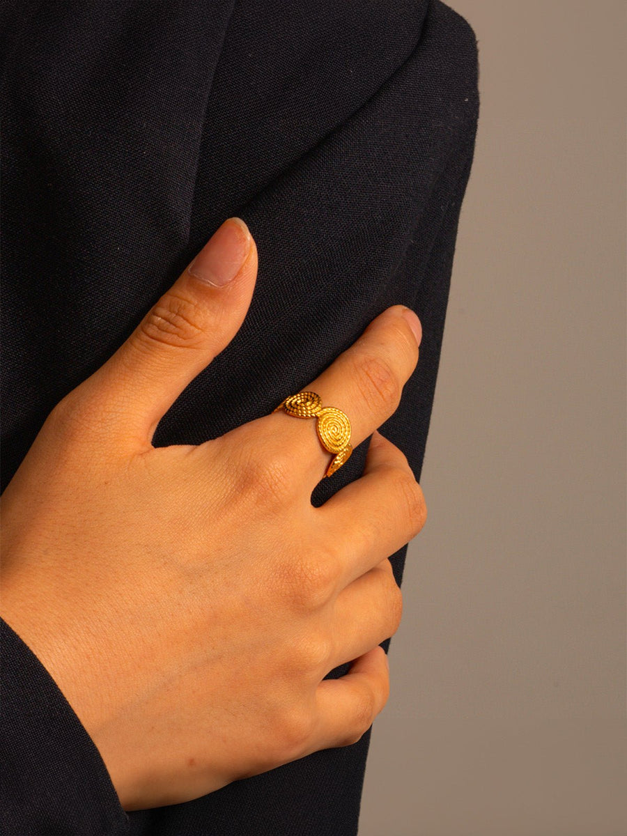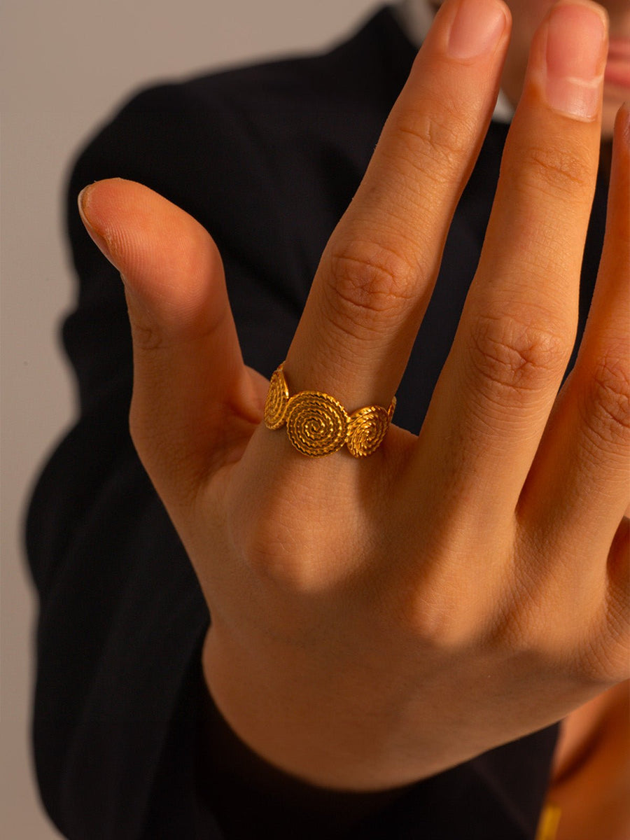 Questo anello aperto placcato oro 18K si ispira alle forme geometriche naturali con le sue spirali finemente cesellate. Grazie alla sua realizzazione in acciaio inossidabile, offre una resistenza eccezionale all’umidità e ai graffi, mantenendo una brillantezza dorata notevole nel tempo.