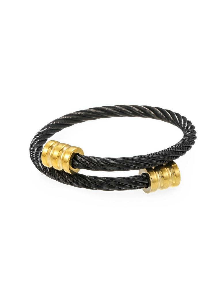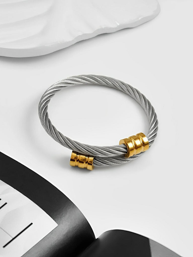 Bestaat uit een gedraaide stalen kabel en gouden metalen details, speelt dit sieraad met contrasten tussen ruwe materialen en verfijnde glans. Het sluit natuurlijk om de pols zonder sluiting, voor een snelle plaatsing en comfortabel dagelijks dragen.