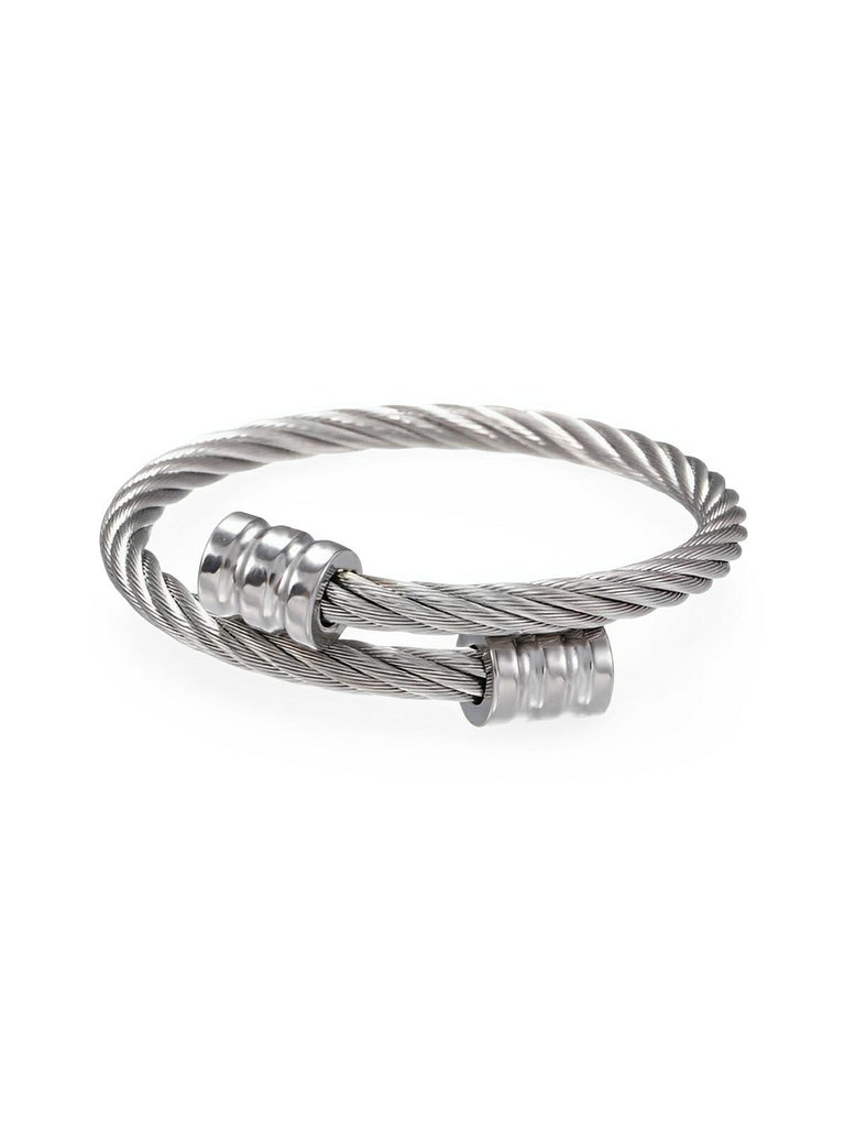 Bevestig uw individualiteit met deze stijve armband van roestvrij staal met een geometrisch en eigentijds ontwerp. Dit gewikkelde model roept kracht en structuur op, terwijl het een minimalistische esthetiek biedt die perfect in de tijdgeest past.