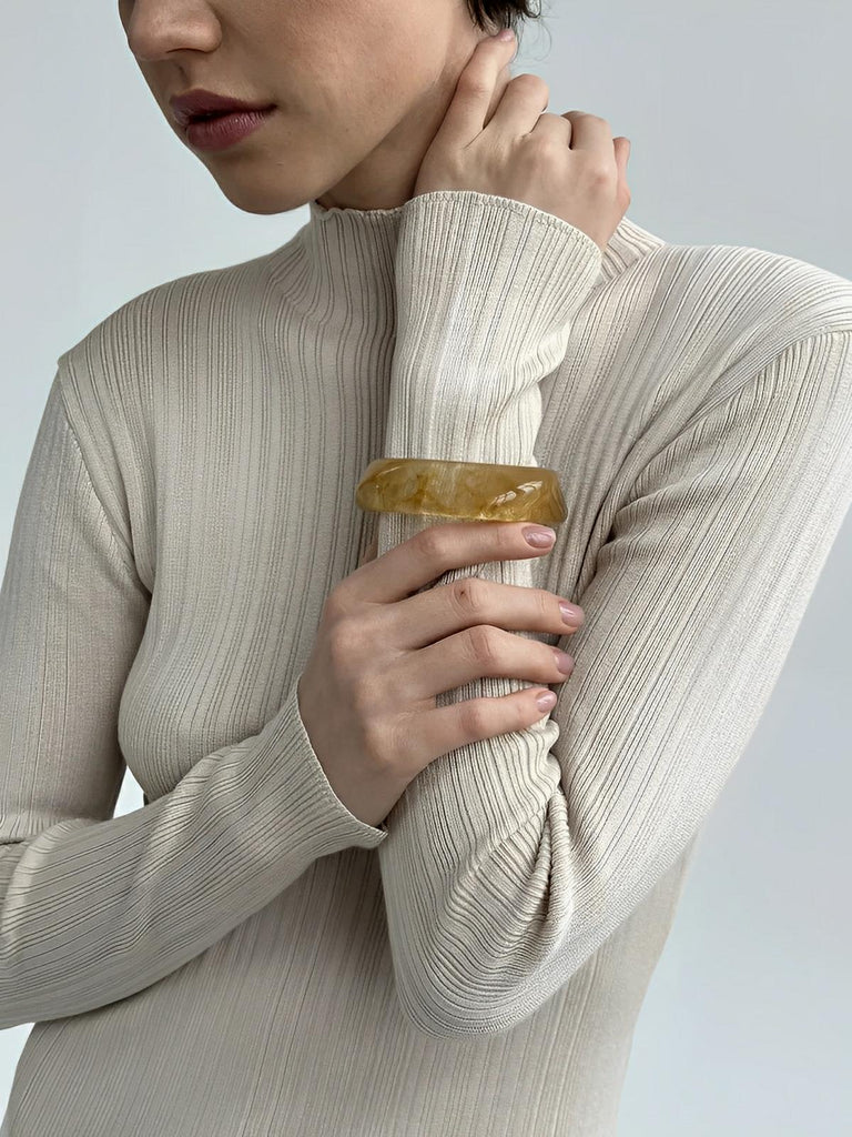 Verkrijgbaar in een palet van zachte kleuren zoals marmergrijs, ivoor of transparant amber, sluit deze armband aan bij een uitgesproken minimalistische trend, door een vleugje karakter aan elke look toe te voegen.