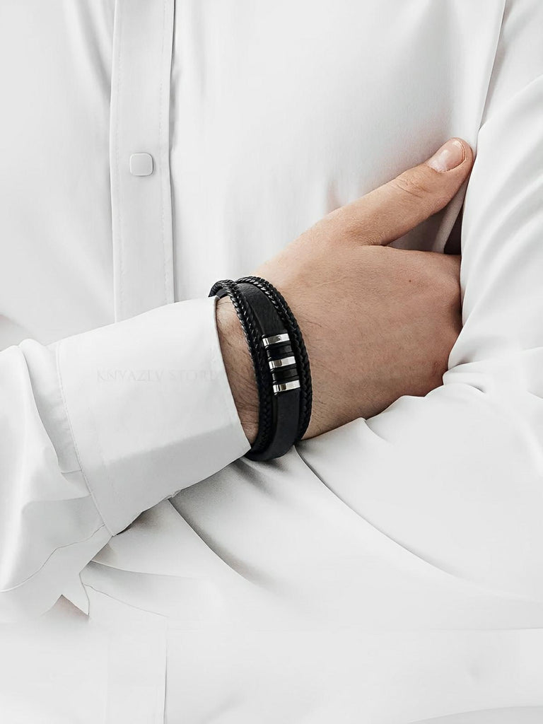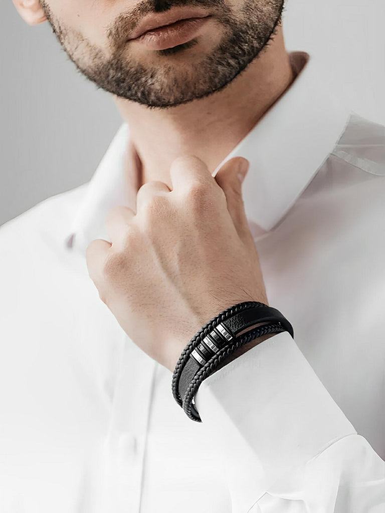 Dit gevlochten zwarte leren armband is een verfijnd accessoire ontworpen voor mannen die op zoek zijn naar de perfecte balans tussen robustheid en elegantie. Het multi-laags ontwerp combineert gevlochten leer met een gladde band, verfraaid met roestvrijstalen elementen die een onderscheidende touch toevoegen.