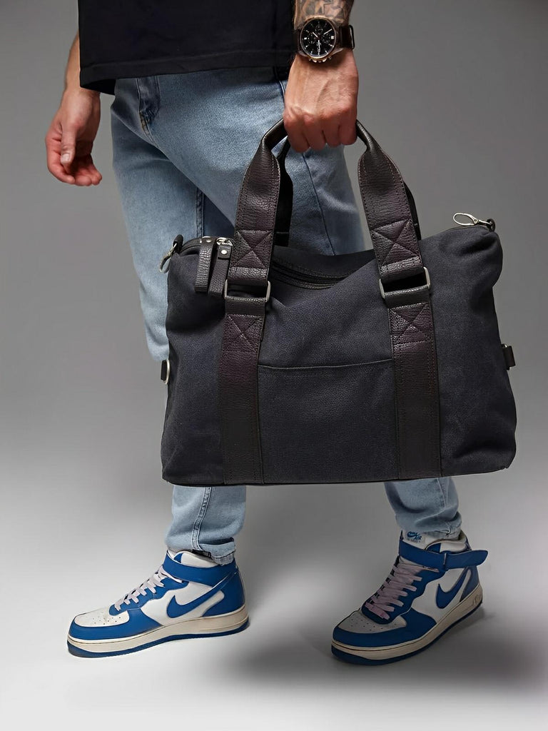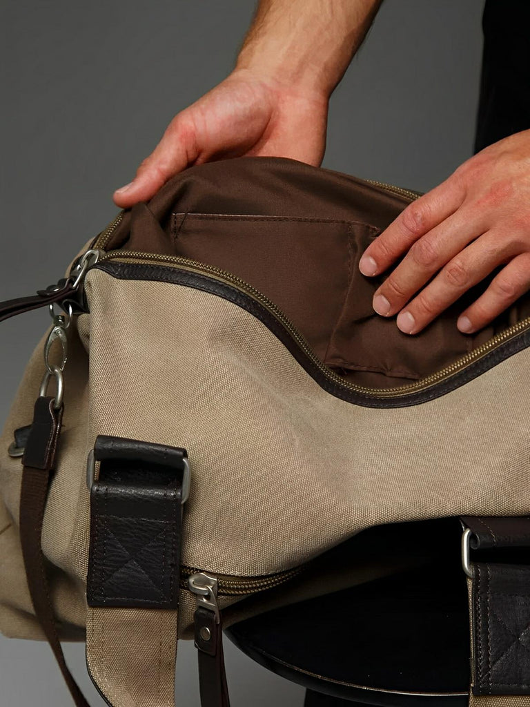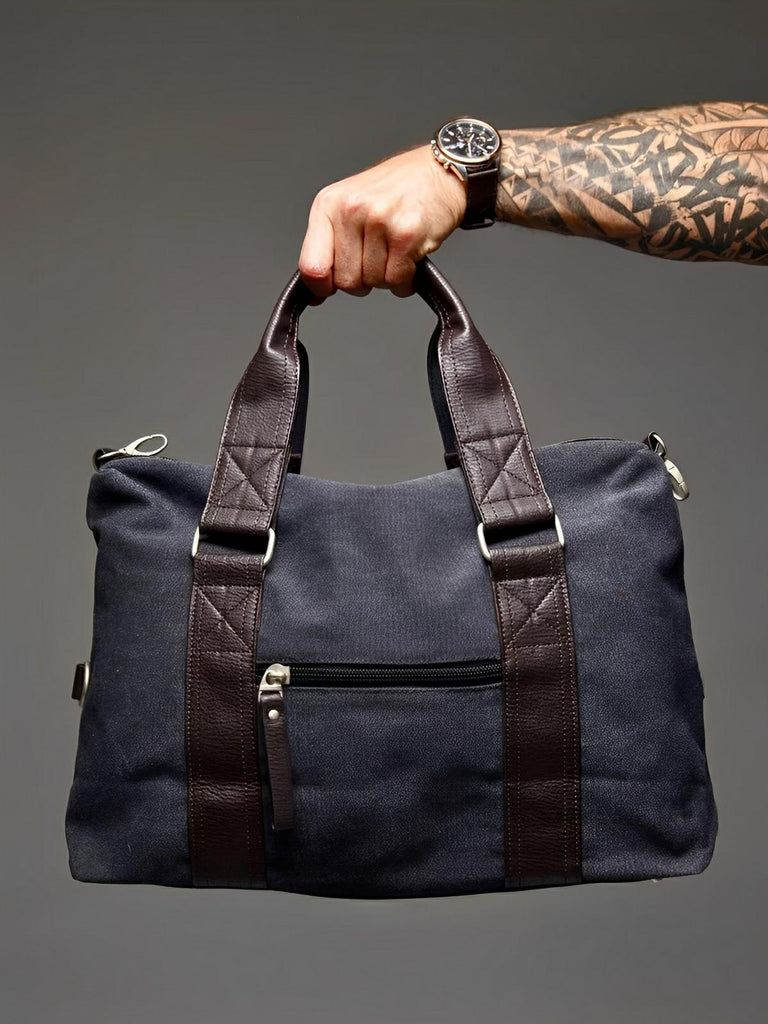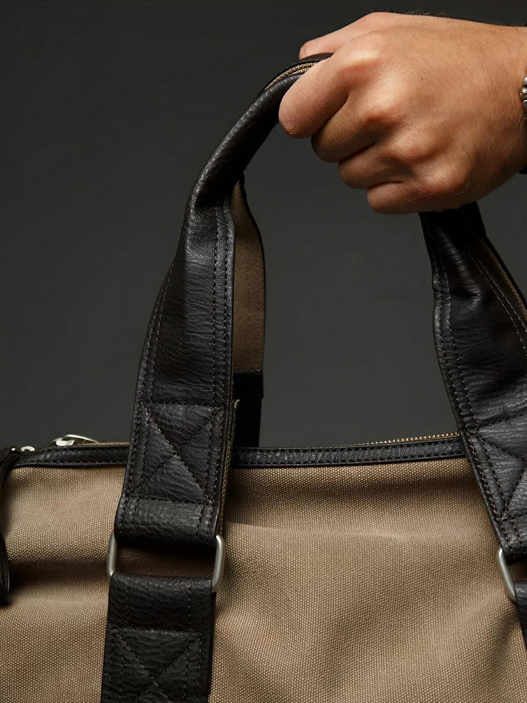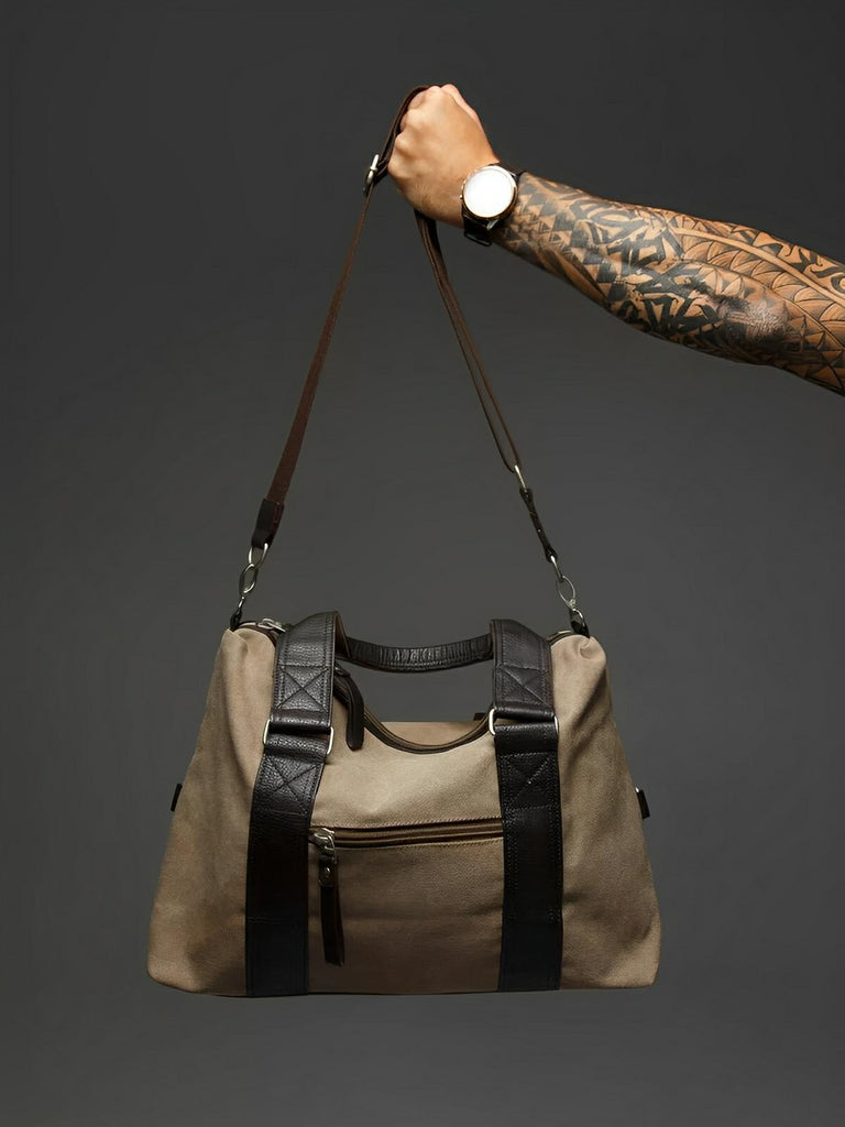 Ontdek een multifunctionele tas, ontworpen om actieve mannen te vergezellen tijdens hun verplaatsingen. Gemaakt van duurzaam katoen met versterkingen van kunstleer, combineert het vintage stijl en robuustheid voor dagelijks gebruik.