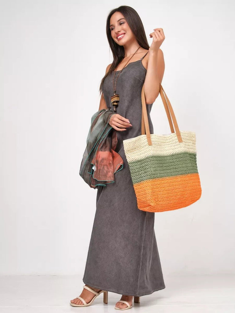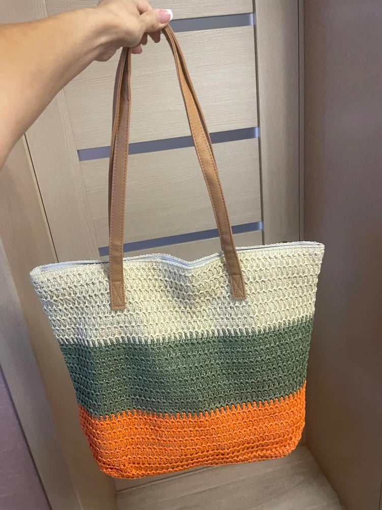 Strandtas cabas, multicolor raffia stro, groot formaat, strand, zomer, veganistische nep leren hengsels, tote bag vakantie, model Julie