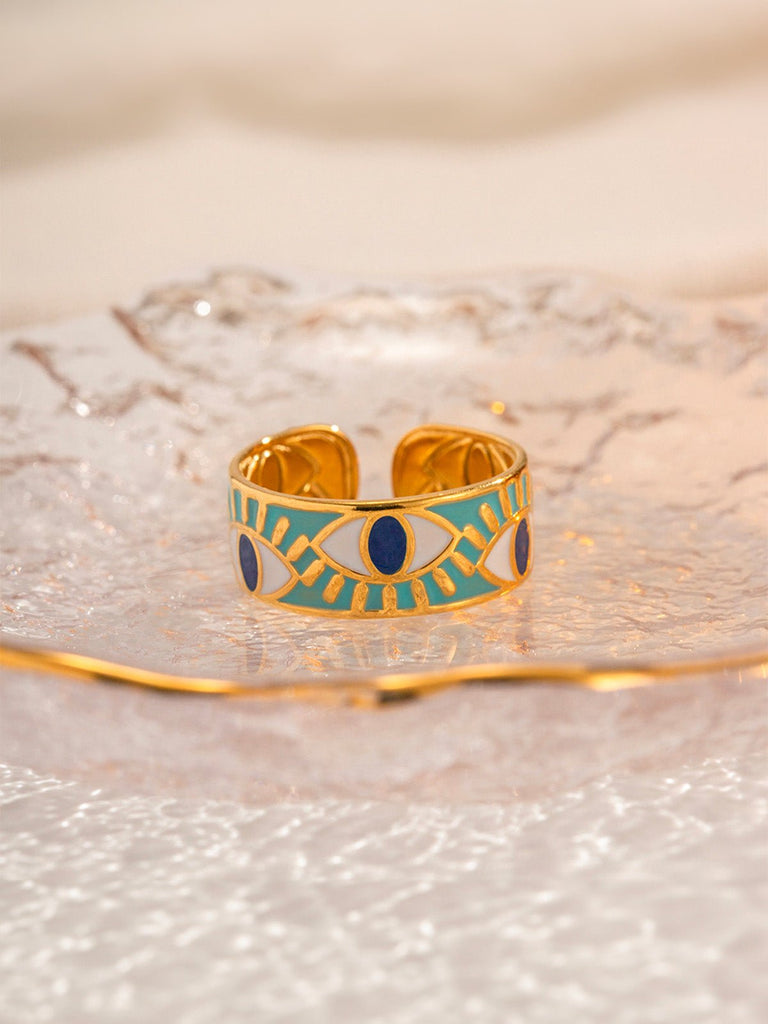 Ring beschermend oog, blauw turquoise, roestvrij staal, geëmailleerd motief, verguld, model Prota