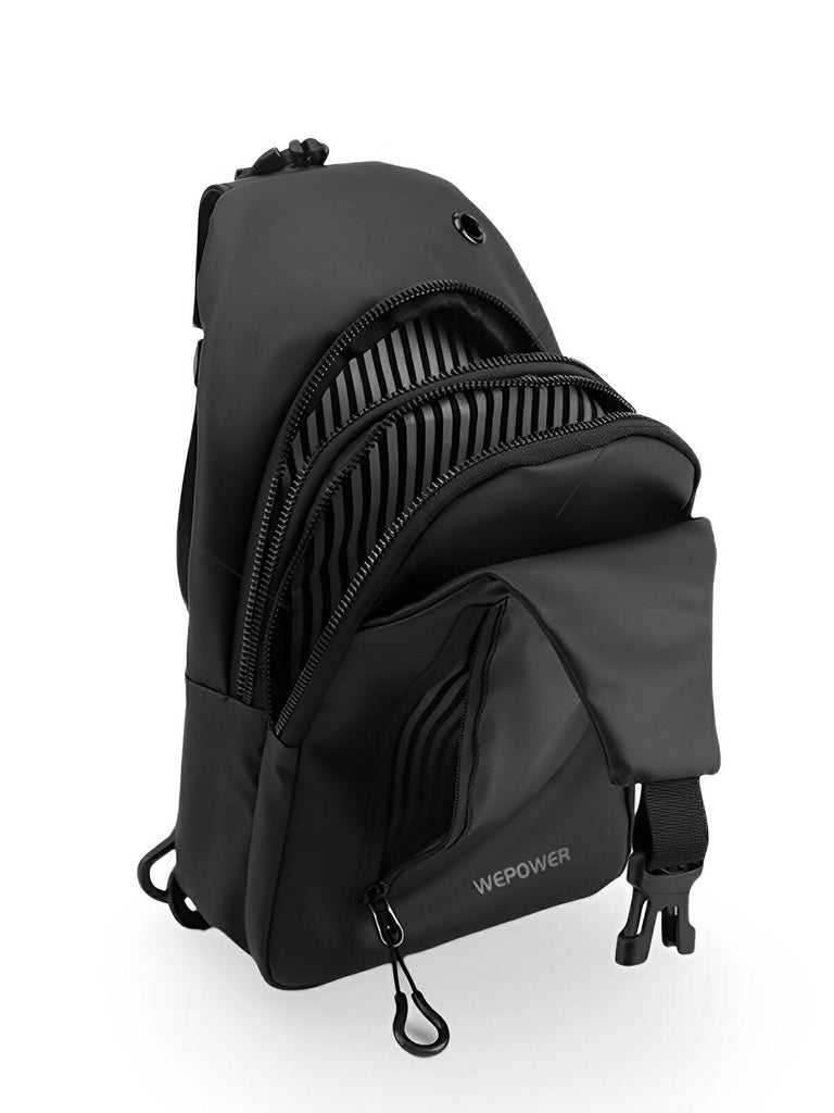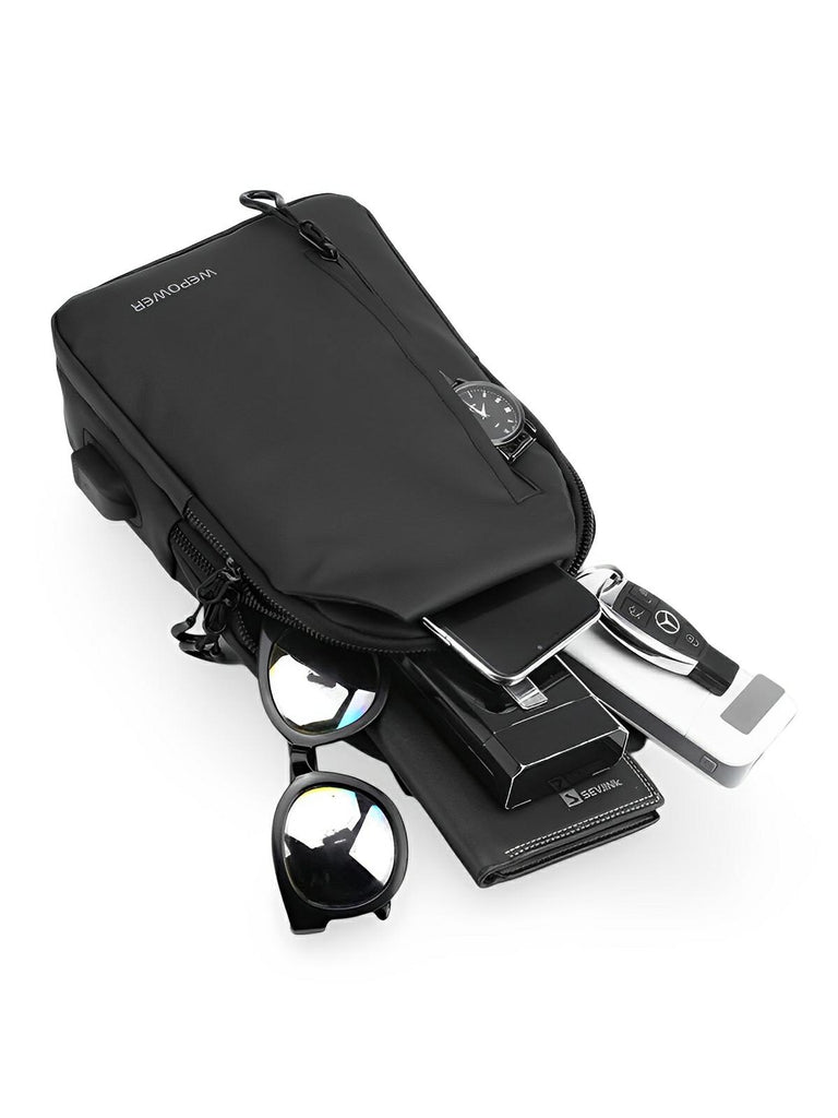 Gemaakt van waterdichte stof, beschermt deze tas uw spullen effectief tegen vocht en spatten. Hij is uitgerust met een geïntegreerde USB-poort waarmee u uw apparaten gemakkelijk onderweg kunt opladen.