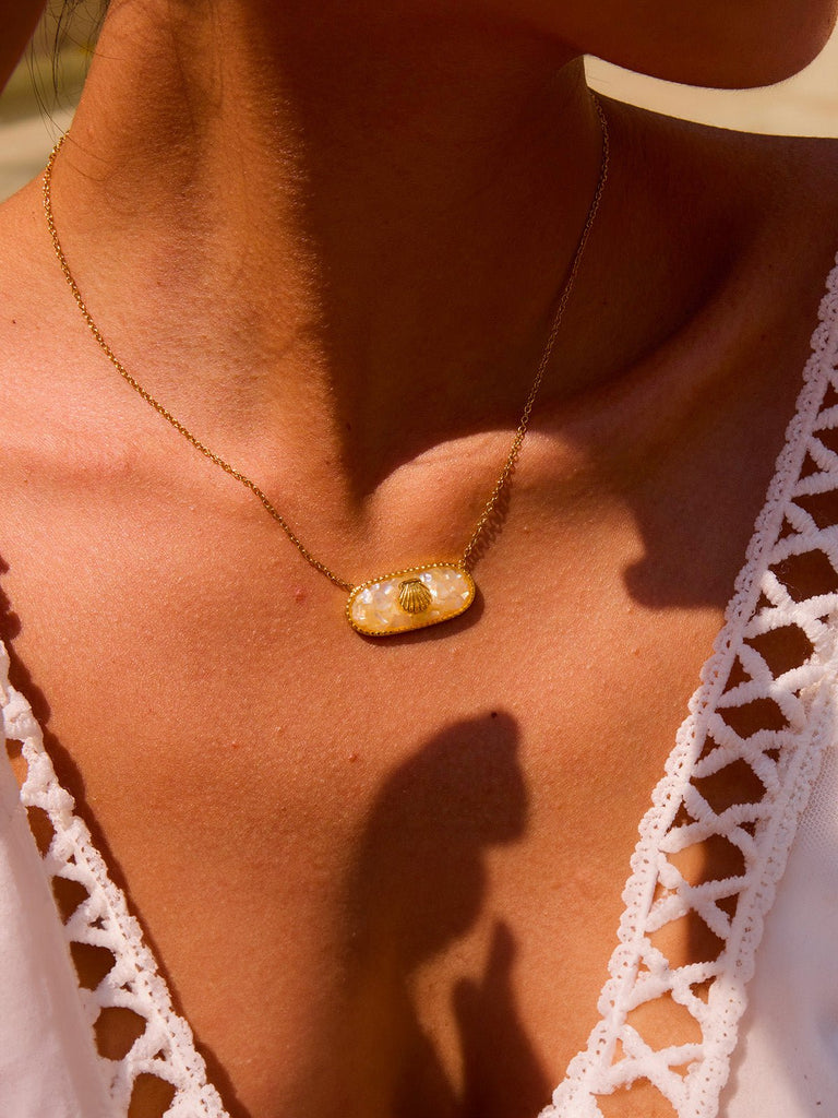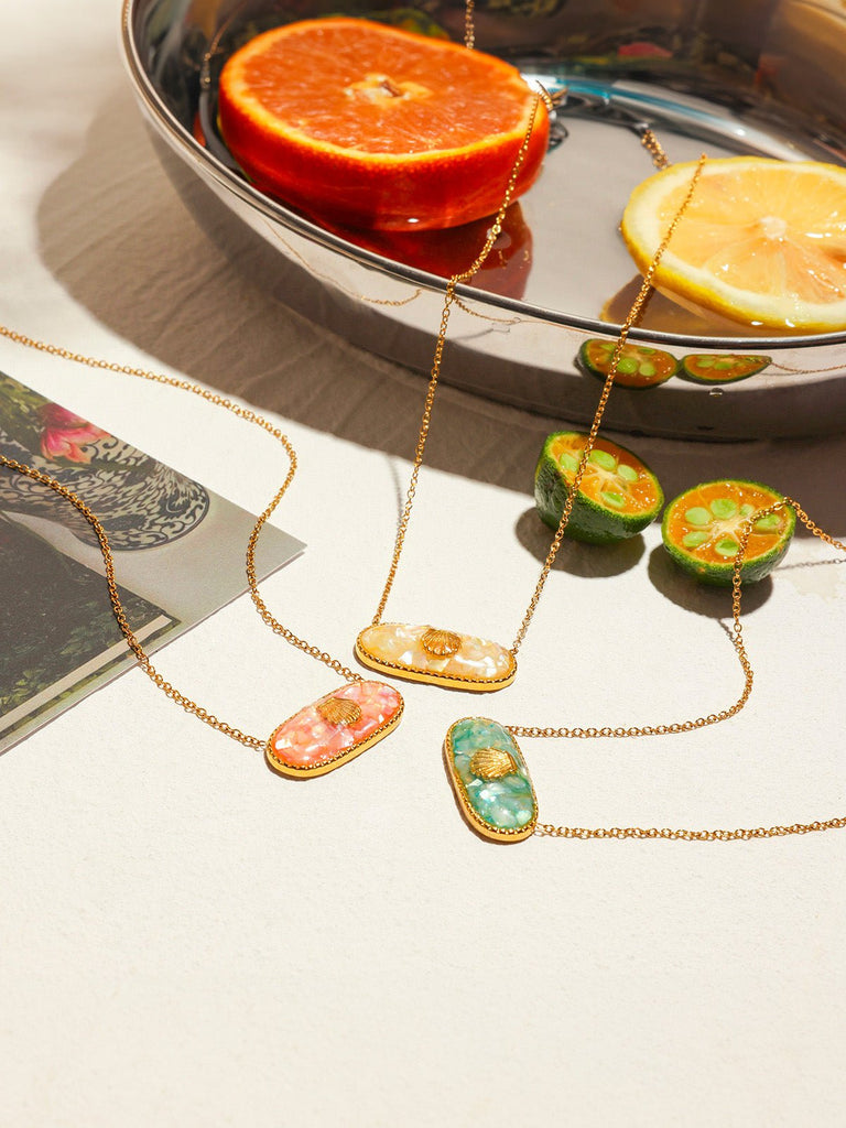 Deze ketting belichaamt de zomerse frisheid door zijn ovaal hanger bezet met parelmoer, verfraaid met een delicate gouden schelp. Hij is verkrijgbaar in drie zonnige tinten – koraalroze, parelmoer geel en lagune blauw – die doen denken aan de kleuren van exotisch fruit en helder water.