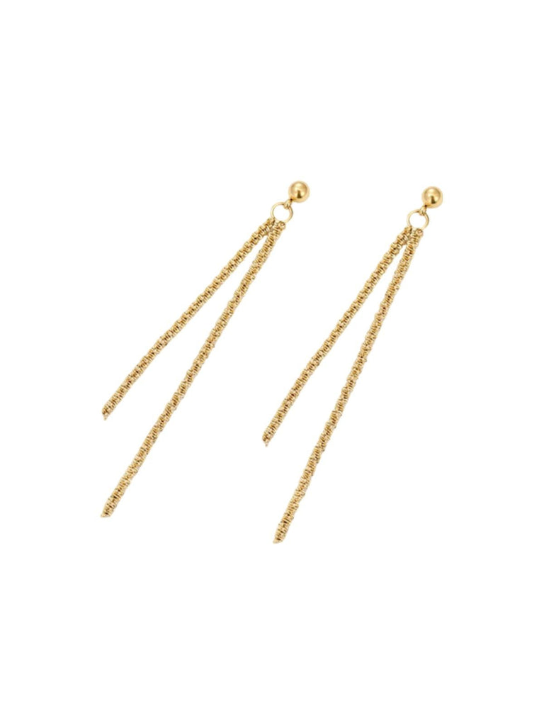 Breng een vleugje licht aan je outfits met deze lange oorbellen. Gemaakt van verguld roestvrij staal, onderscheiden ze zich door een delicaat geometrisch ontwerp en een dubbele vloeiende ketting die eindigt in een verfijnde kwast. Hun lichte en doordachte structuur zorgt voor een natuurlijke val, ideaal om de halslijn te accentueren.