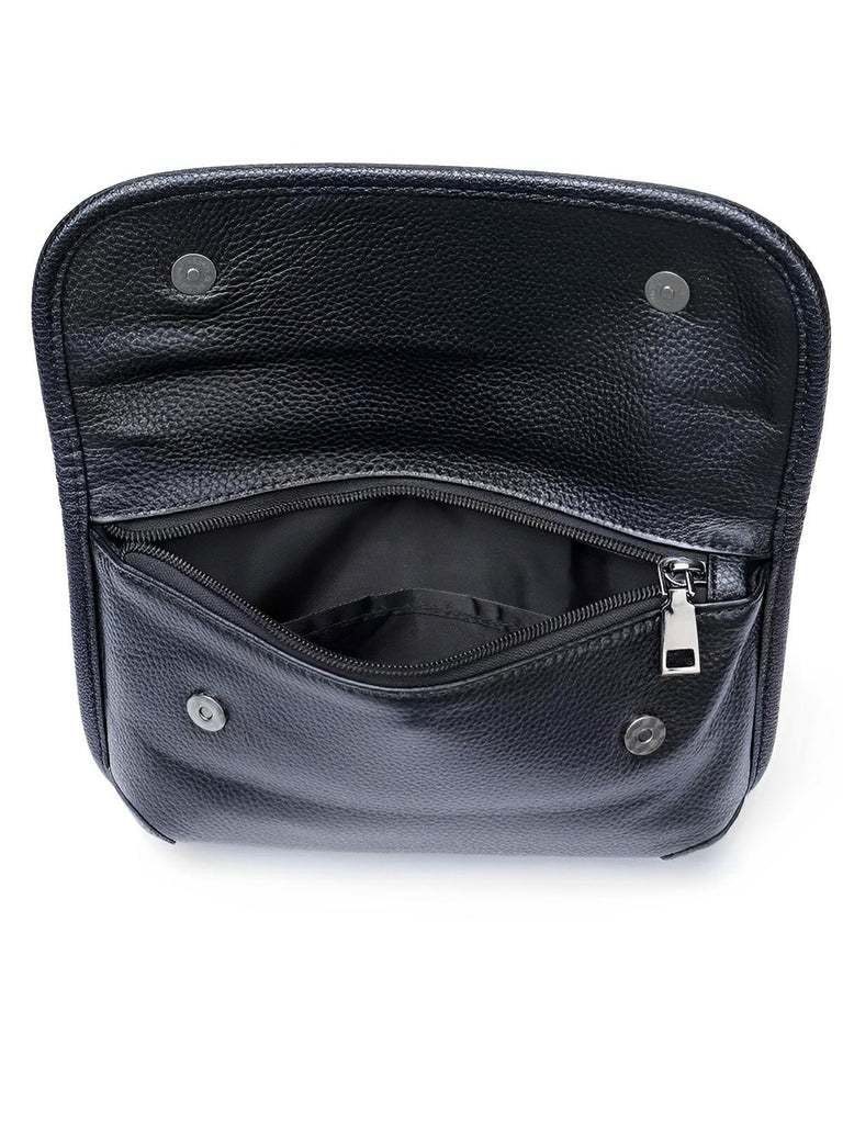 Gemaakt van echt leer, heeft het een lichtgerande textuur die het een sobere en moderne uitstraling geeft. Het sluitingssysteem combineert een flap met magnetische knopen met een rits voor een versterkte veiligheid. Aan de binnenkant biedt een hoofdcompartiment, gevoerd met textiel, plaats voor een portemonnee, telefoon en andere kleine voorwerpen, terwijl een ritsvak de persoonlijke spullen veilig stelt.