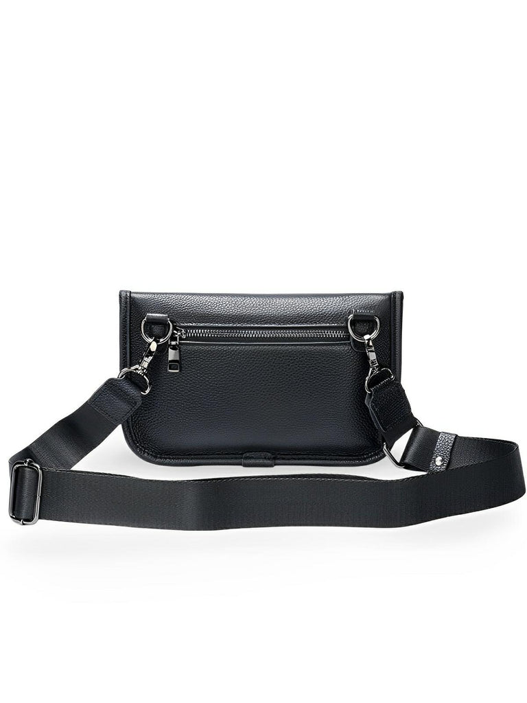 Aan de achterkant biedt een discrete ritszak extra ruimte, ideaal voor het opbergen van voorwerpen die snel toegankelijk moeten zijn. De verstelbare schouderband, die tot 120 cm kan worden verlengd, zorgt voor een comfortabele draagwijze over het lichaam of op de schouder.