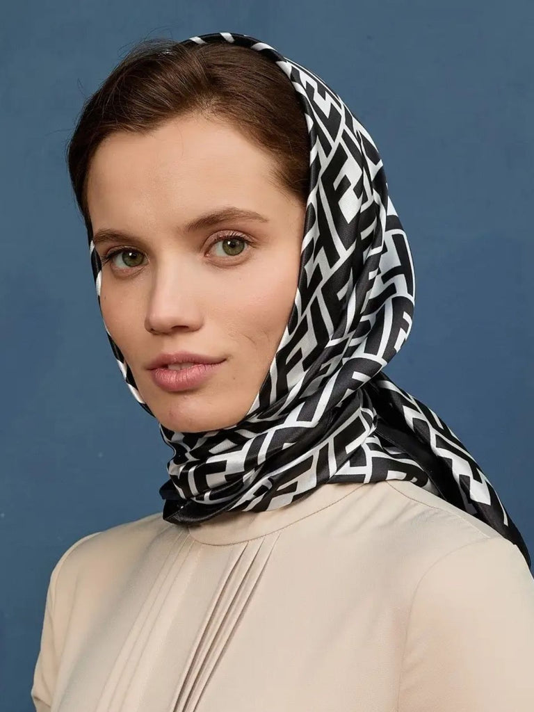 Vierkante sjaal zijdeachtig zwart-wit, geometrisch bedrukt haaraccessoire, vloeibare satijnen hals sjaal, modieuze hoofdband, chique stedelijke stijl sjaal, polyester vierkant zijde-effect, moderne damessjaal, model Leyla