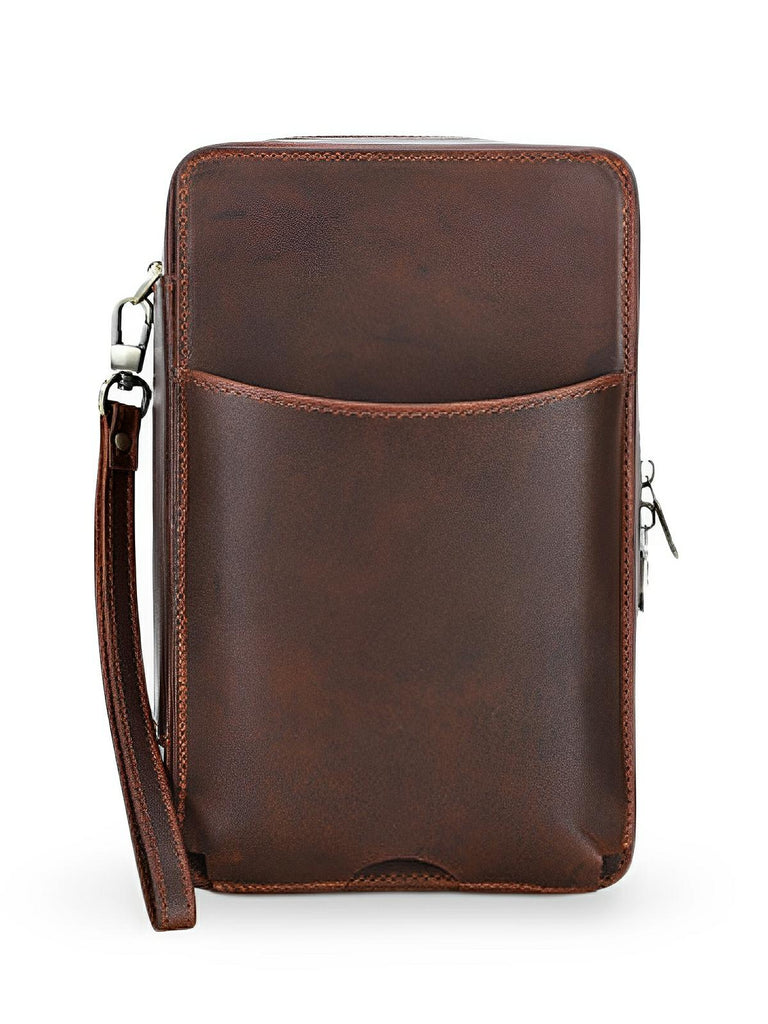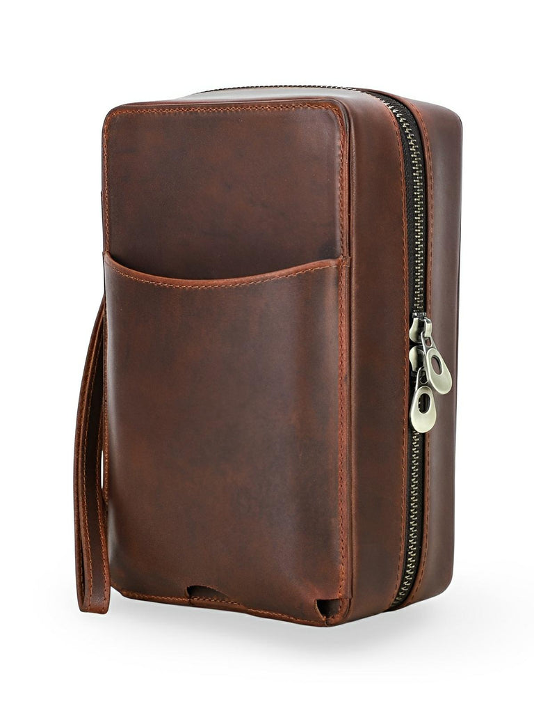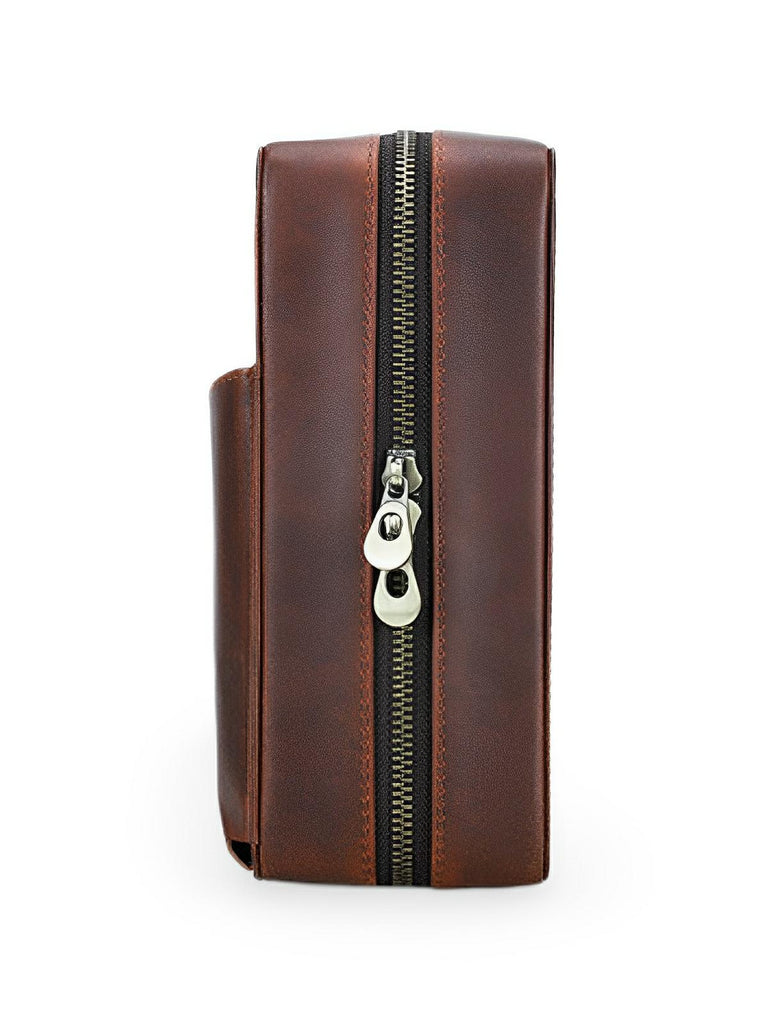 Compact en elegant, deze sigarenkist heeft een leren draagriem voor eenvoudig transport. Een buitenzak maakt het mogelijk om telefoon en essentiële documenten op te bergen. Of het nu voor persoonlijk gebruik is of als verfijnd cadeau, deze kist is onmisbaar voor sigarenliefhebbers.